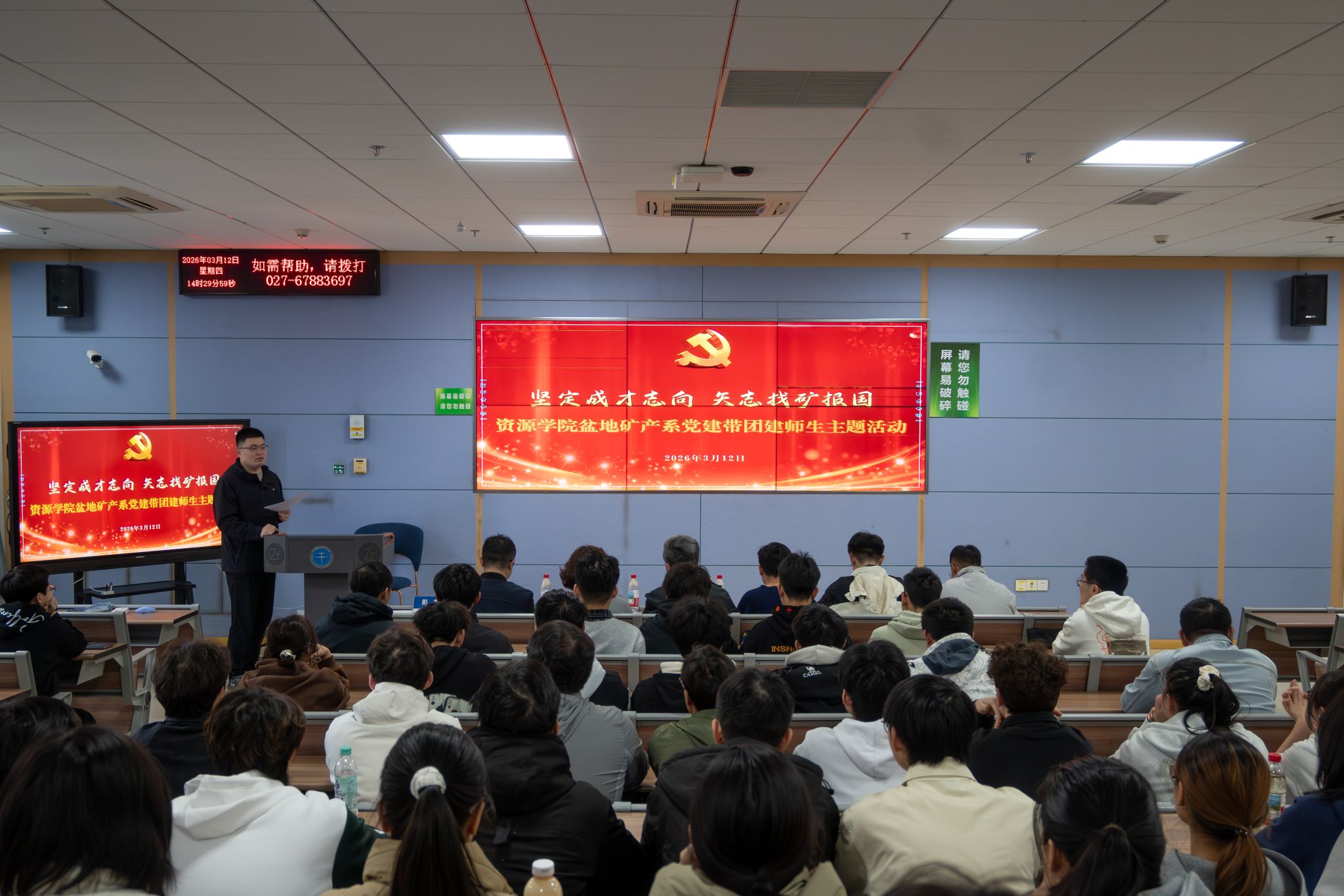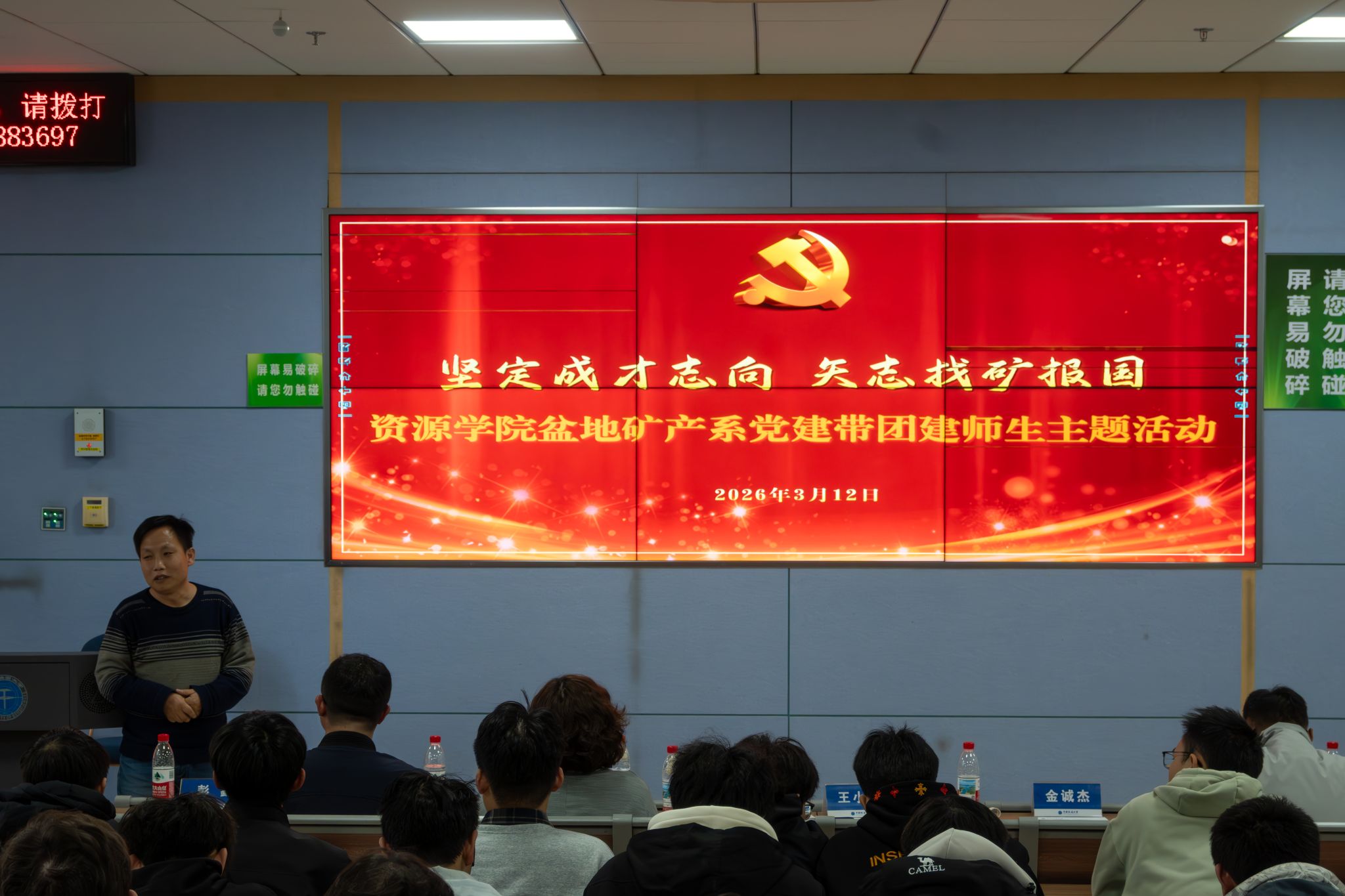 盆地矿产系在东区教学楼C0203教室举行“坚定成才志向 矢志找矿报国”党建带团建师生主题活动。盆地矿产系教授王华,系党支部书记王小明,系副主任、班主任吴立群,班主任荣辉,学生党建办主任彭鑫,煤系多能源学生党支部党员蒋庆灵,学校大学生科学技术协会主席金诚杰及盆地矿产系各年级本科生参加活动。彭鑫老师主持会议。