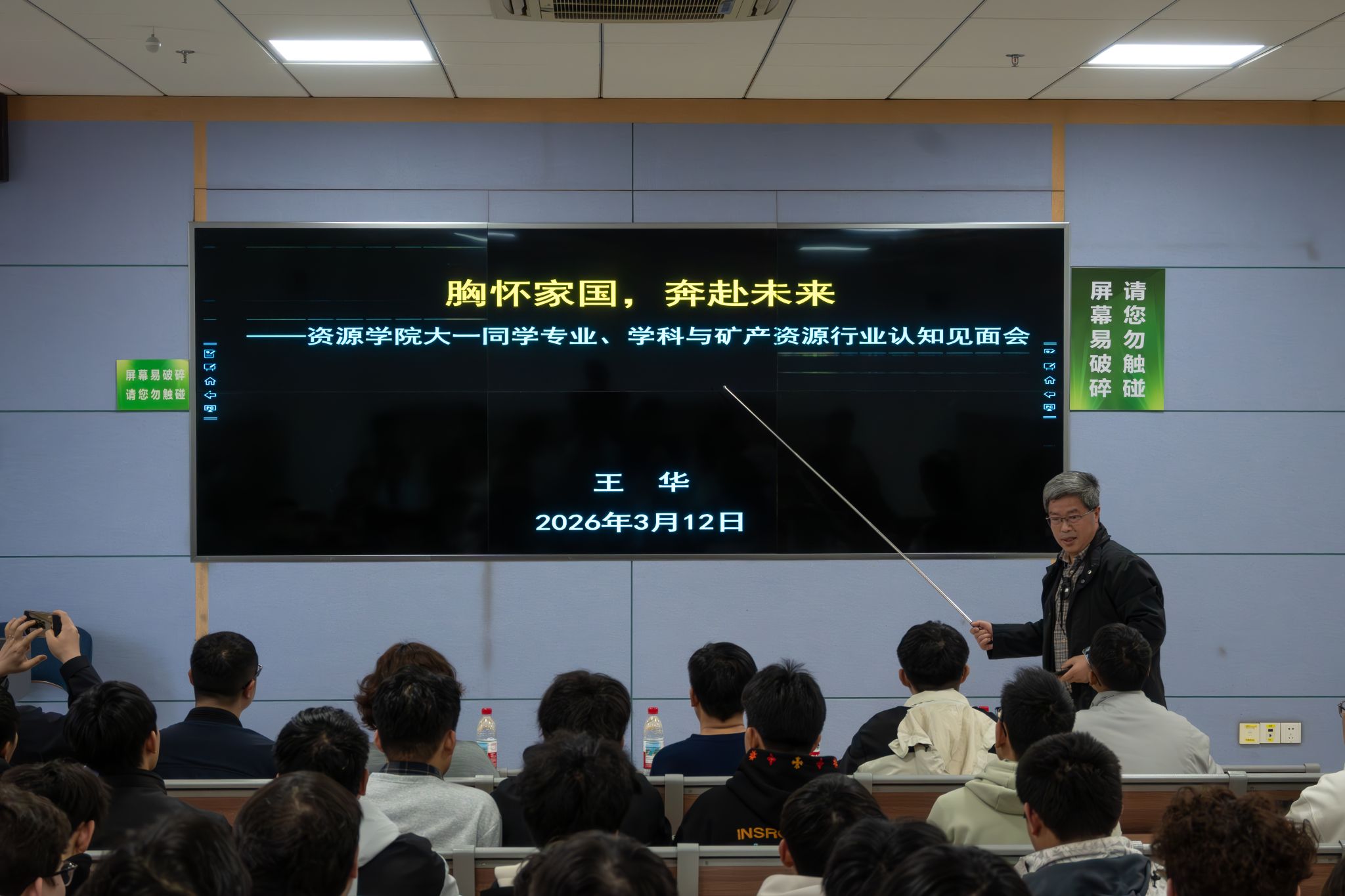 在专题报告环节,王华教授以《胸怀家国,奔赴未来》为题,结合自身多年深耕地质找矿领域的科研与实践经历,生动诠释了地质人“艰苦朴素 求真务实”的校训精神。他深入分析了当前国际地缘政治格局深刻调整背景下,我国在能源安全和关键矿产资源领域面临的战略形势,系统解读了国家新一轮找矿突破战略行动的核心要求。他强调,作为新时代资源学子,必须深刻认识到所学专业在保障国家能源资源安全、支撑经济社会可持续发展中的重要作用,要自觉把个人理想融入国家发展大局,在服务国家战略需求中实现人生价值。