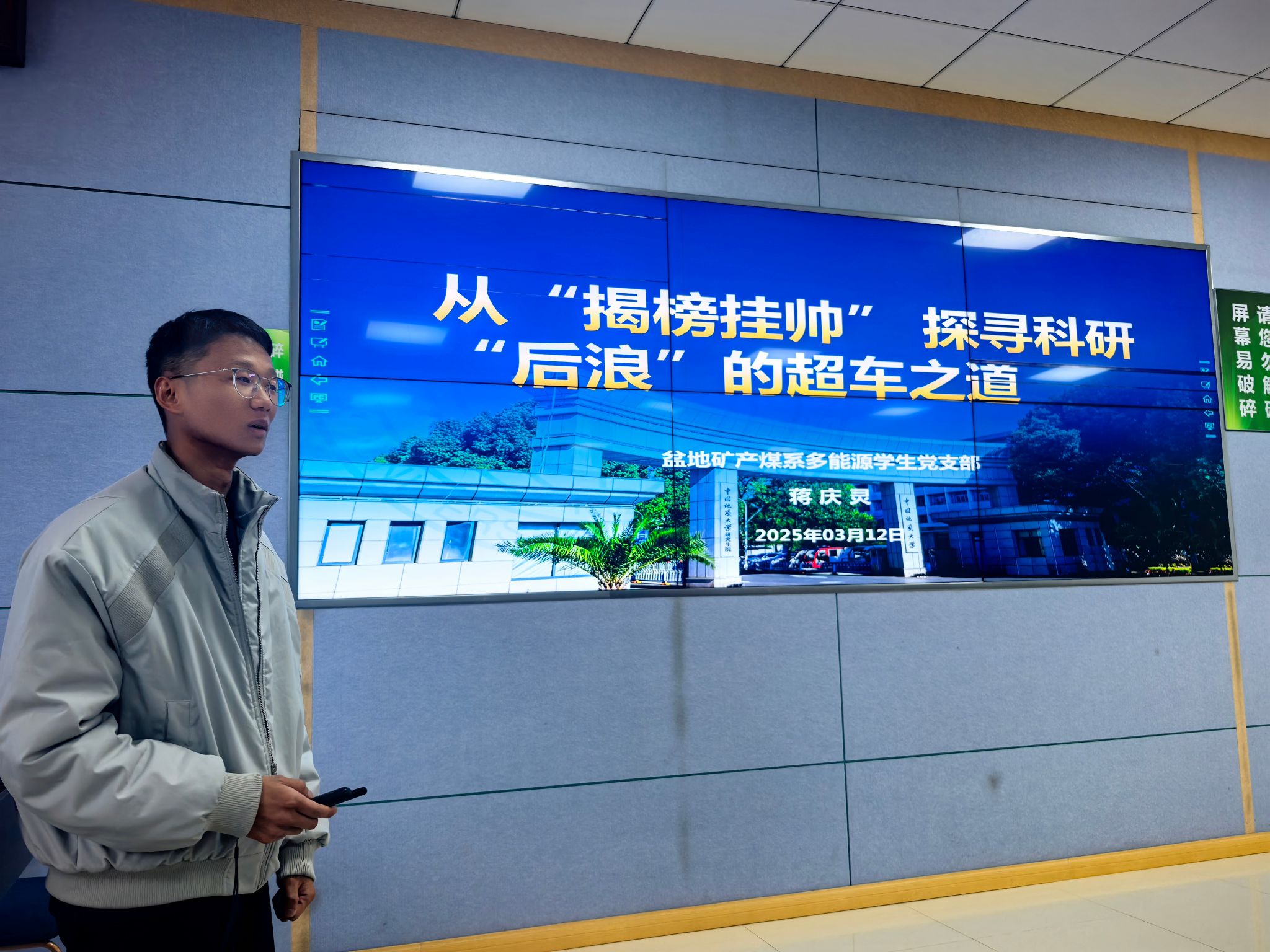 煤系多能源学生党支部党员、“挑战杯”揭榜挂帅专项赛全国一等奖团队主要成员蒋庆灵分享了参赛成长与体会。他从地质思维培育、科研方法探索、AI技术辅助找矿、团队协作攻关等方面,全面展示了项目从构思到成果落地的完整路径,展现了青年党员“脚踏实地、勇于创新”的精神风貌,激励在场同学敢于尝试、积极作为。